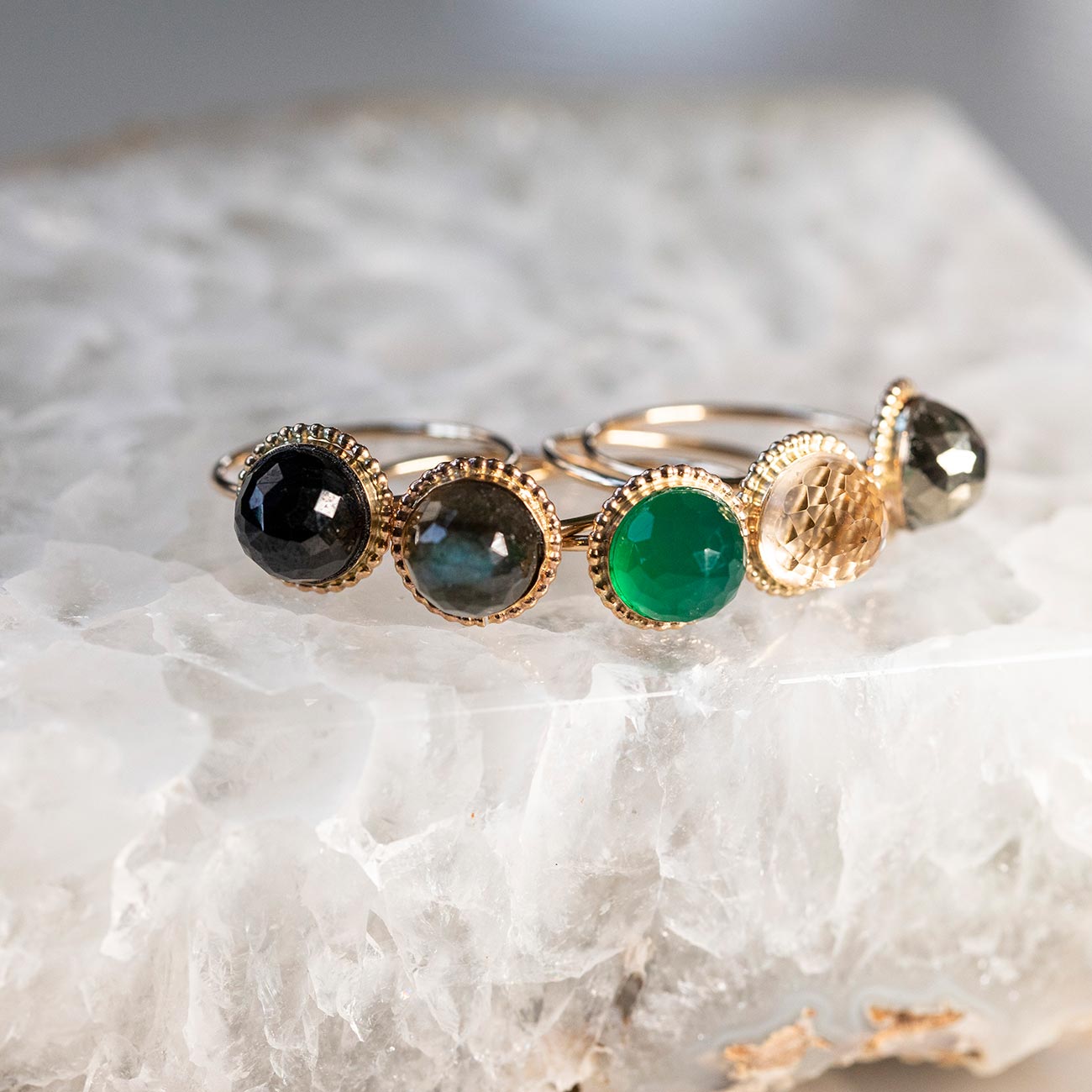 Beautiful 8mm domed faceted gemstone in 14k goldfilled setting. Available in Pyrite, Crystal Quartz, Black Spinel, Green Onyx, and Labradorite, in sizes 4.5-8.